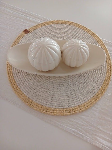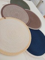 Centros de mesa realizados en soga trenzada de 7 mm, de 43 cm de diámetro. En un único color o combinado con el borde en otro color. Realizar la aclaración en el caso de ser combinado y colores elegidos de acuerdo al catálogo de colores.